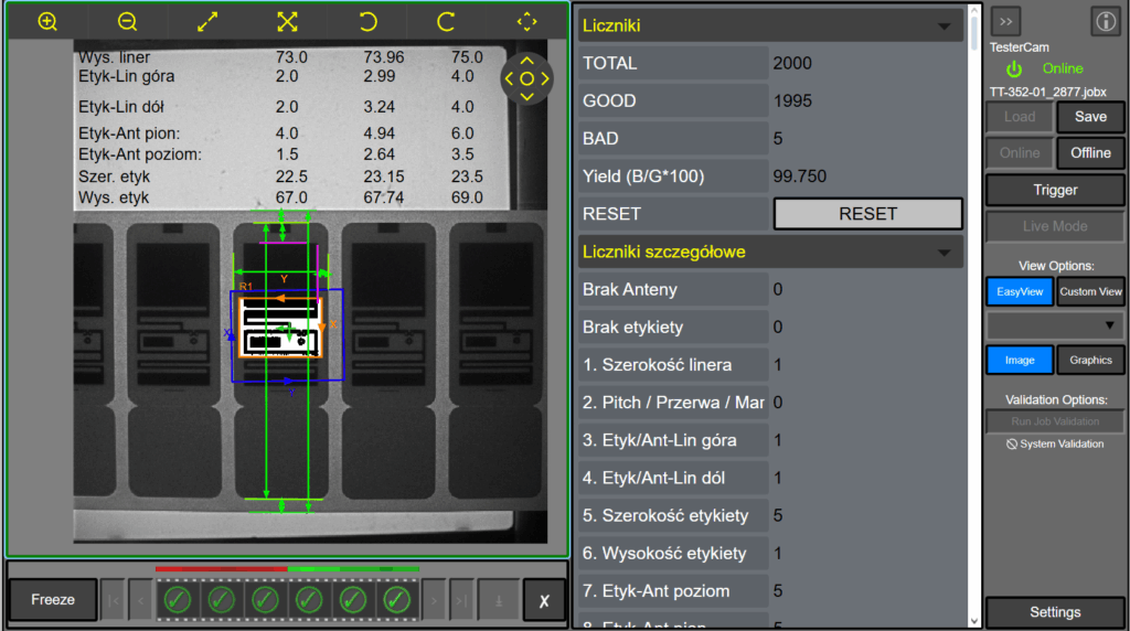 Wdrażamy systemy wizyjne do kontroli jakości produktu w czasie rzeczywistym. Nasze systemy wykonują pomiary metryczne, i jakościowe, wykrywają przekroczenia ustalonych tolerancji i określają wadliwe egzemplarze. Mogą je oznaczać lub odrzucać. Posiadamy własne zaawansowane rozwiązania do sprzęgania systemu wizyjnego z modułem zadruku i/lub modułem „reject” na linii produkcyjnej.